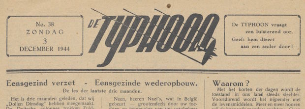 pa en oma Dol lazen De Typhoon, want ze woonden in Zaandam en droegen het roode hart links. Die verzetskrant was vernoemd naar een Brits oorlogsvliegtuig, maar opa en oma spraken het op z’n Nederlands uit: `de Tiefoon’. Wisten zij veel…